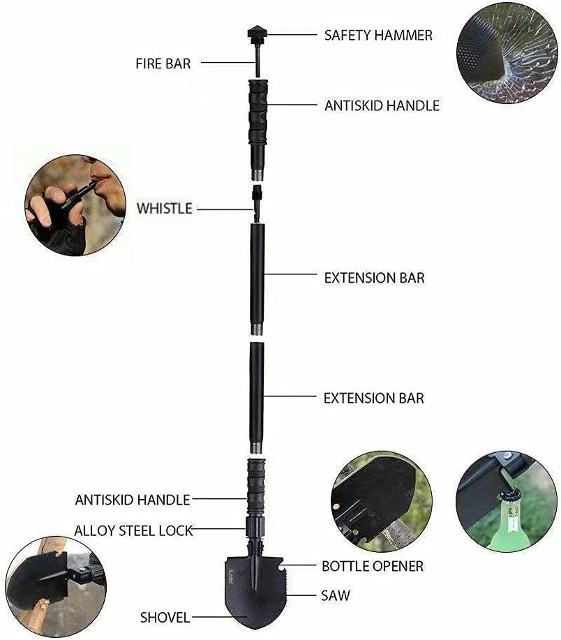 What sets this folding shovel apart is its extension bars, offering features that go beyond the ordinary survival shovel. In one compact tool, you'll find a Shovel Board, Saw, Bottle Opener, Emergency Whistle, Fire Bar, Hammer, Nail Extractor, Hoe, and Fish Scaler Tool. Moreover, the extension bars allow you to adjust the shovel's length to your comfort, whether you prefer standing or digging from a seated position.